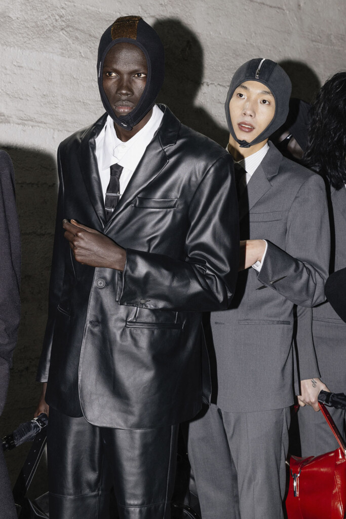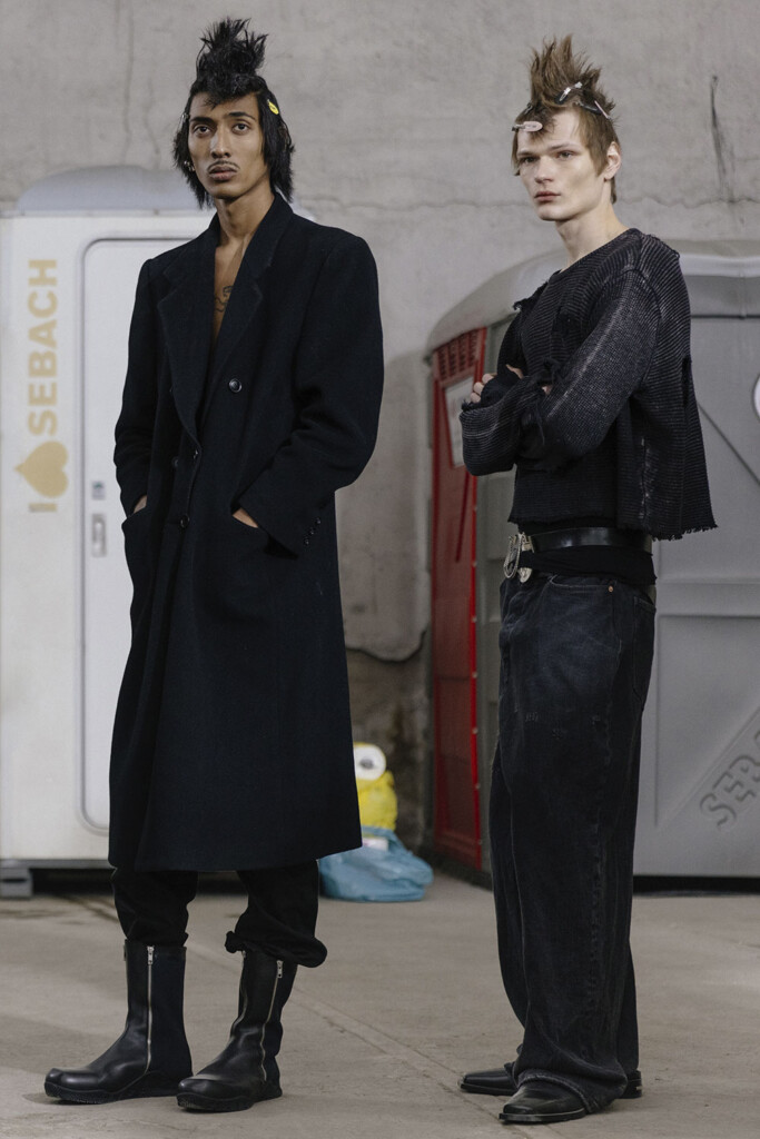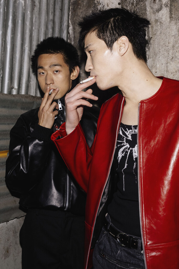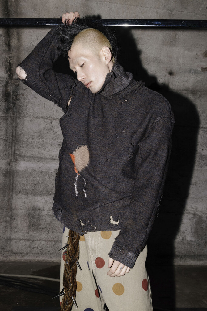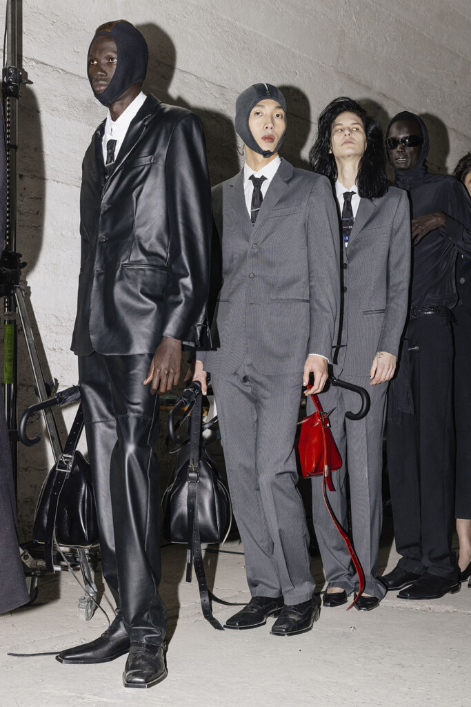 As the show commences, viewers are greeted with impeccably tailored silhouettes, a nod to the finesse of Italian tailoring. However, this strictness is ingeniously juxtaposed with the rebellious spirit of British subcultures. The collection dares to defy, with cufflinks transformed into dangerous spikes and trousers designed with provocative zippers and audacious backless cuts. It’s clear that JORDANLUCA isn’t just presenting clothes; they are making a statement.