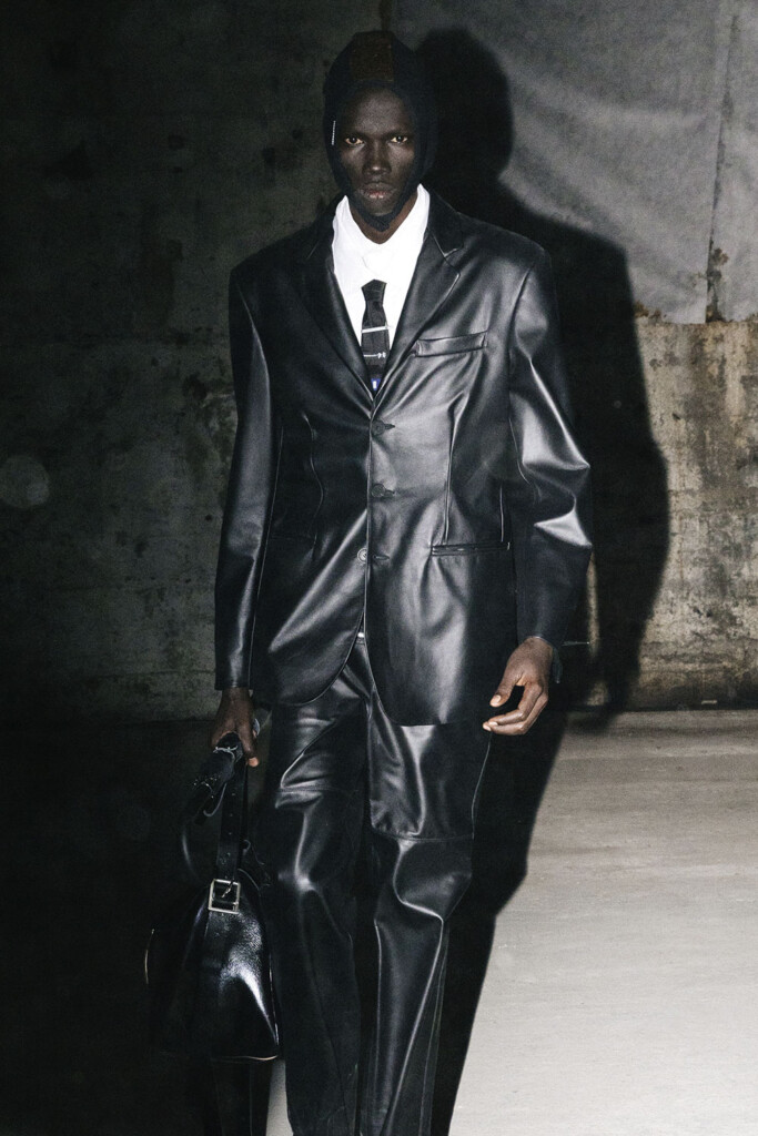 The progression of the show is a transition from tailored elegance to the unapologetic freedom of rave culture. A standout moment is the appearance of a leather coat and boots ensemble, brought to life by Andreas Kronthaler, the iconic partner and creative director of Vivienne Westwood. Here, the collection nods to the underground, with circular cutouts on garments echoing the polka dots of the balloons, a harmonious blend of design and symbolism.
