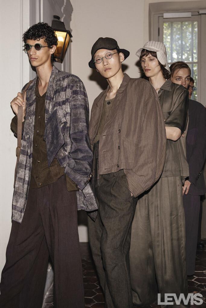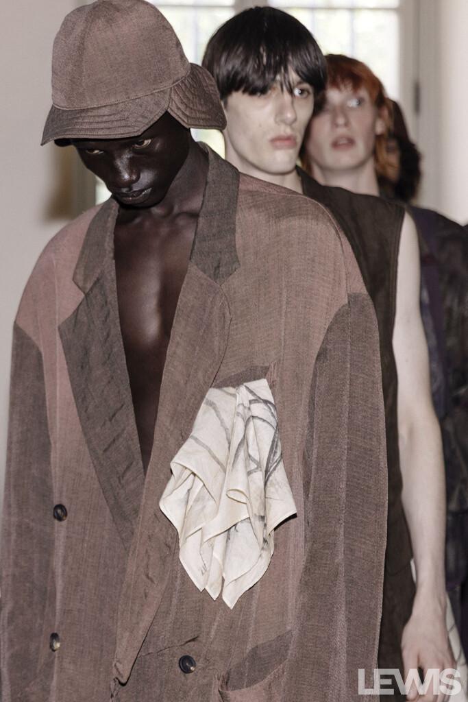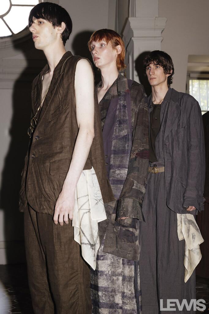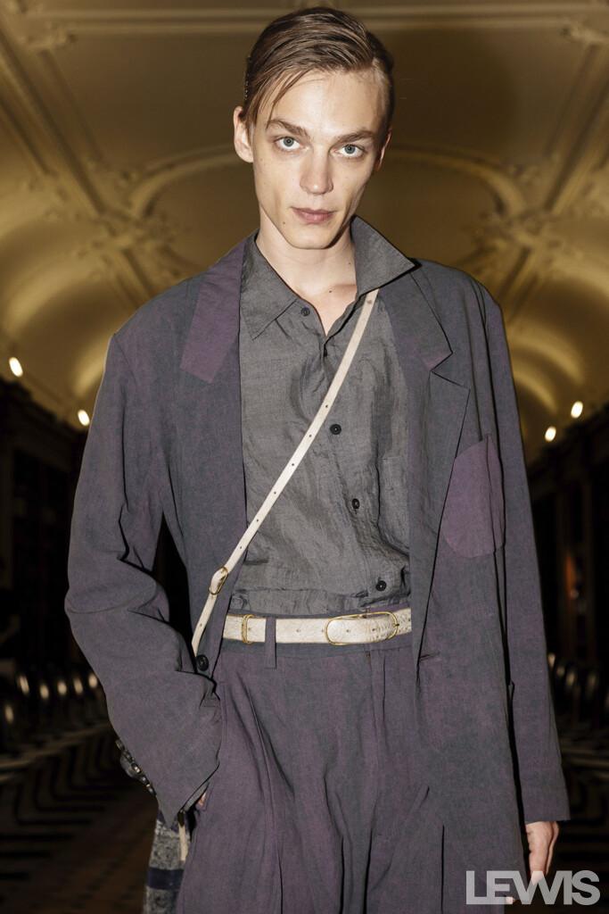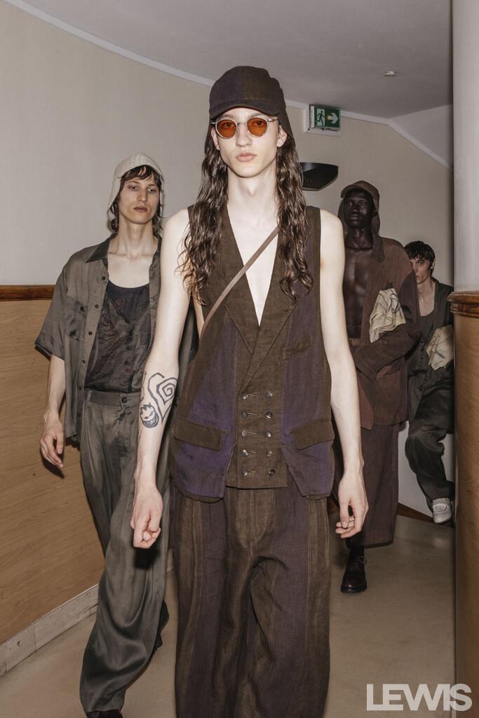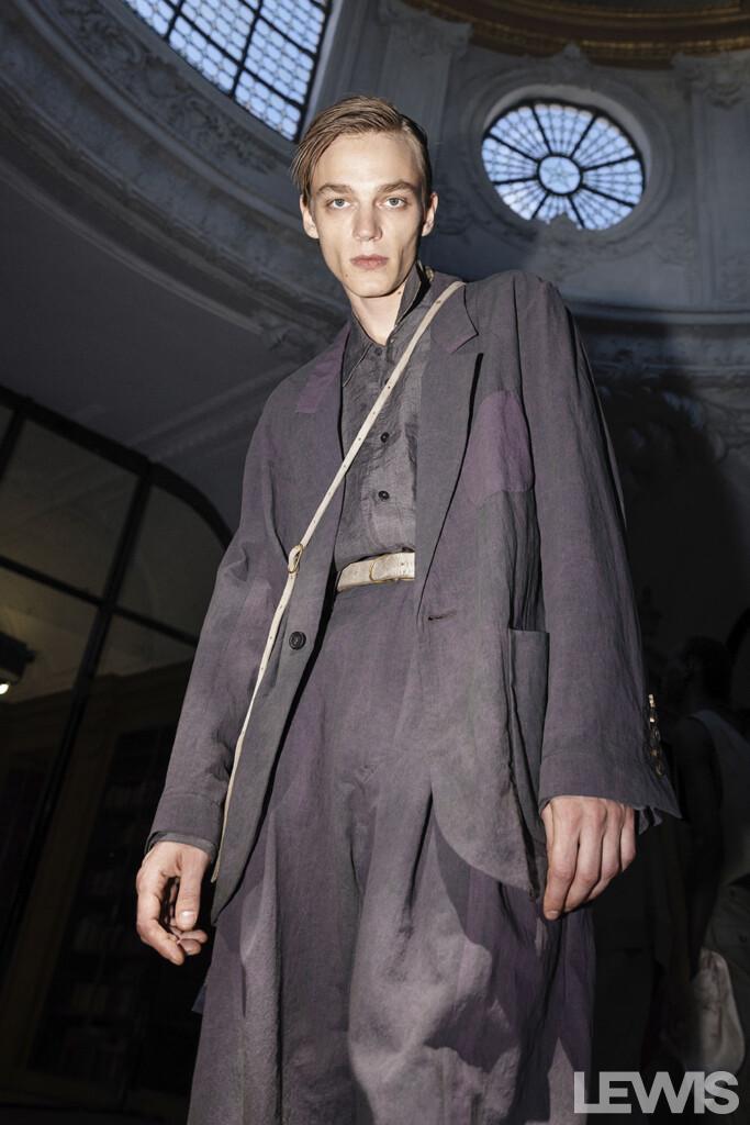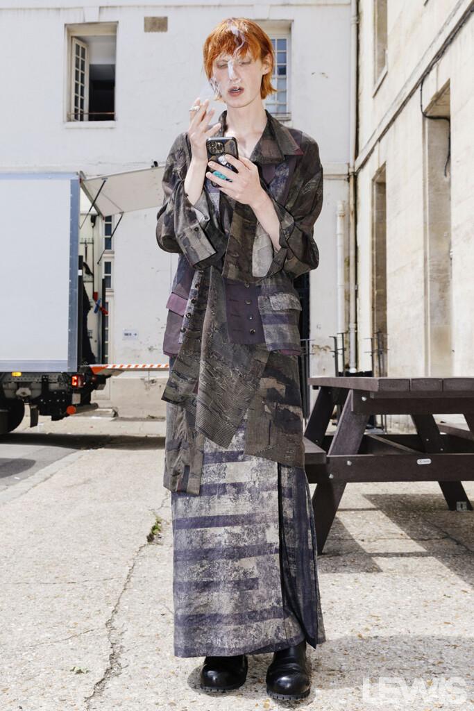 The color palette of the Spring-Summer ’25 collection is a testament to Chen’s artistic vision. The hues are reminiscent of colors faded by time, with various shades of purple, greens, and greys. These colors evoke images of garden walls entwined with strong, intricate branches, offering a sense of nostalgia and timeless beauty. The materials used in the collection further enhance this effect, drawing inspiration from the textures and patterns found in nature.